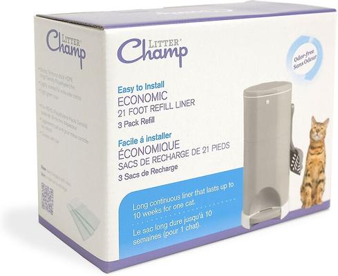 This product includes three 21-foot liners. Once you step on the convenient hands-free foot pedal on the Litter Champ Premium Odor-Free Cat Litter Waste Disposal System, it will open all compartments and allow you to dispose of the waste.