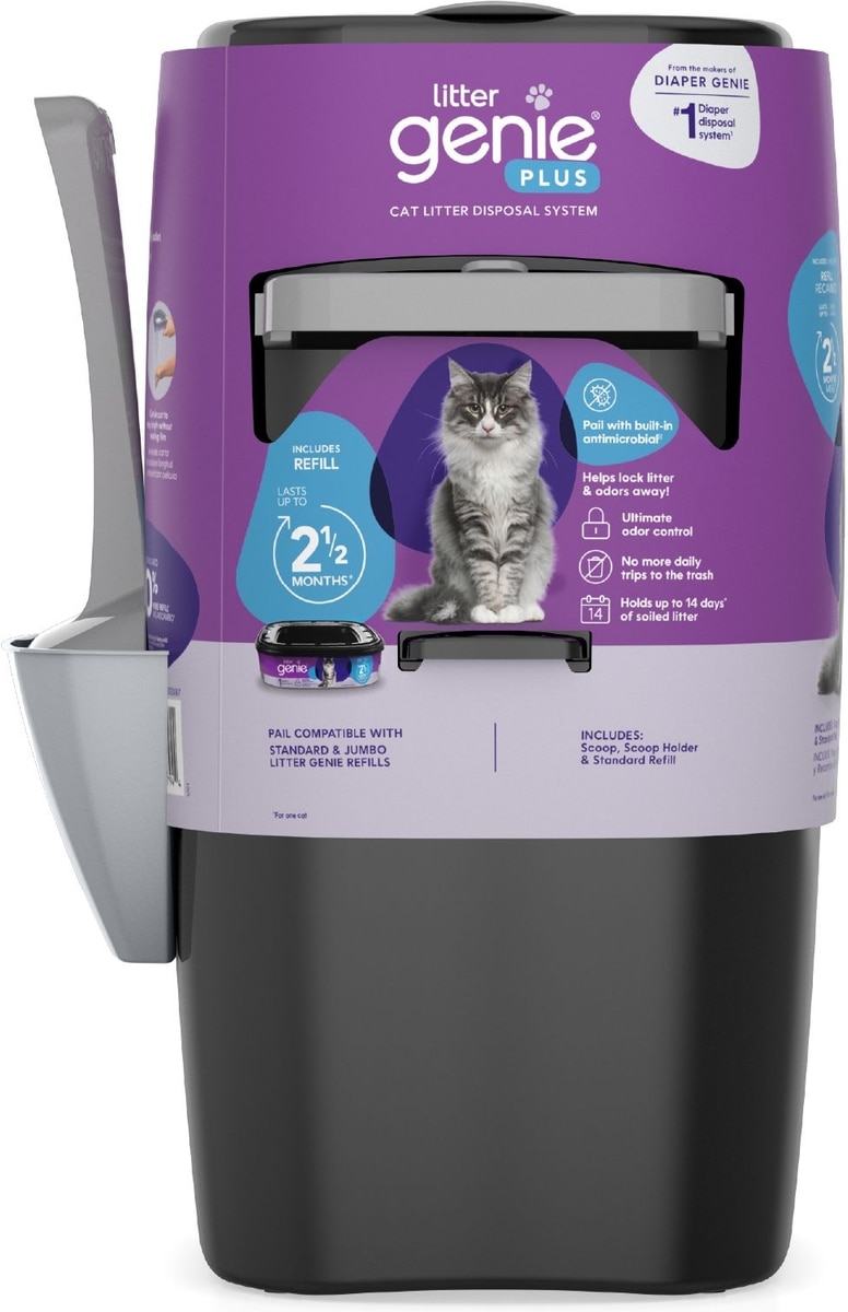 - The Plus model includes a litter scoop with attached holder and the Plus refill is 30% larger than the standard Litter Genie refill.