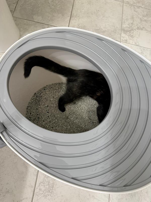 This is by far my favorite litter box. The top entry helps contain litter scatter, and the grooves in the top improve that even more as it catches anything left on their paws when they jump up. It's like a built in scatter mat! Cleaning is easy. I just pop the lid off, scoop the clumps and poop out, and pop the lid back on. When it's time to change the litter out, I pop the lid off, scrape the litter, wrap a trash bag around the edge, and pour it out. Fill with new litter and pop the lid back on! I love that it comes with a scoop that hangs on the edge, so it's not touching anything but right there to scoop! My kitten got in right away and played with the litter. She loves it too!