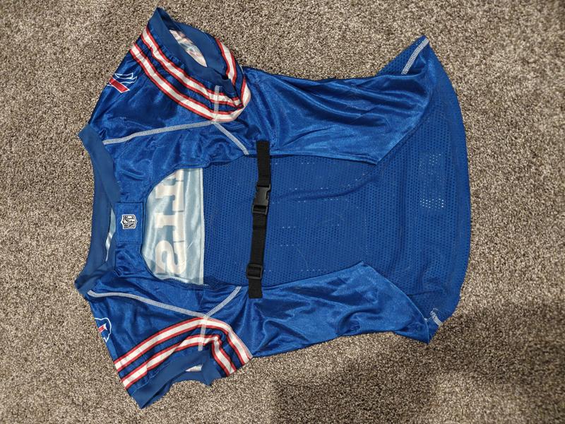 These jerseys are really nice quality. The buckle attachment does make it nice for adjusting the size and getting it on the dog. Unfortunately my dog is boycotting the Bills Mafia as she refused to be still long enough to get a photo with it on.