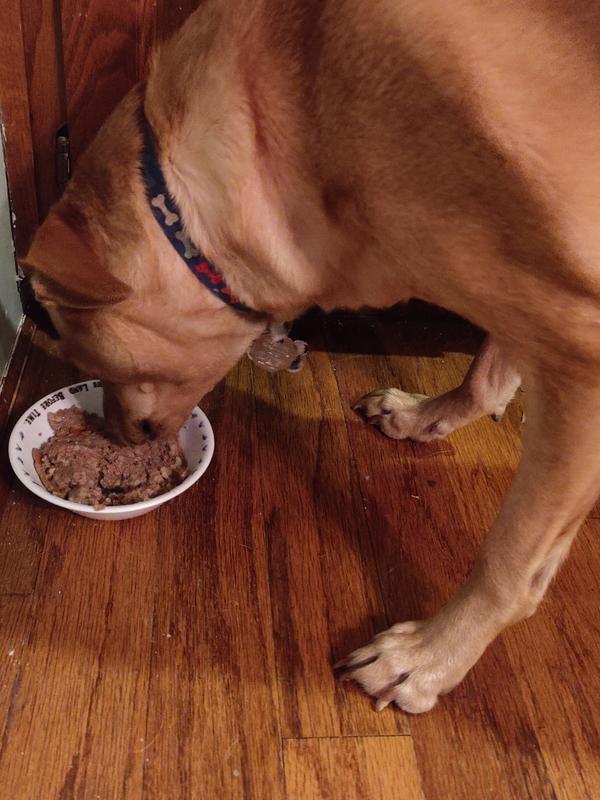 I have this to my dog and his tail was wagging excited for more. It is soft food with not extra liquid which I liked so it meant more actual food. You can see different colors and pieces in it like carrots. I take it he like it because he kept going back to where the cans were and staring at them.
