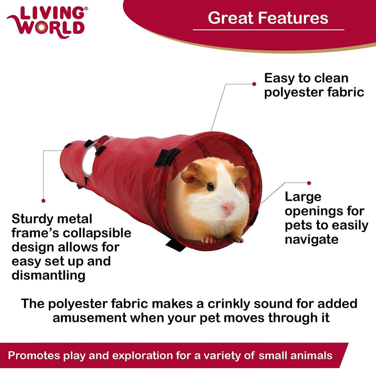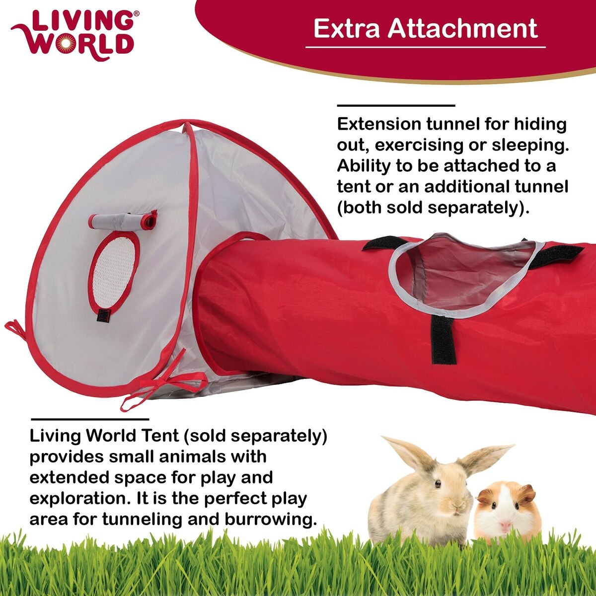 The Living World Tunnel is specially designed to attach to a Living World Small Tent for small pets (sold separately). Both ends of the tunnel have Velcro that allows you to attach the tunnel to the tent. You can also attach another tunnel of the same diameter to an opening located at the midway point of the tunnel.