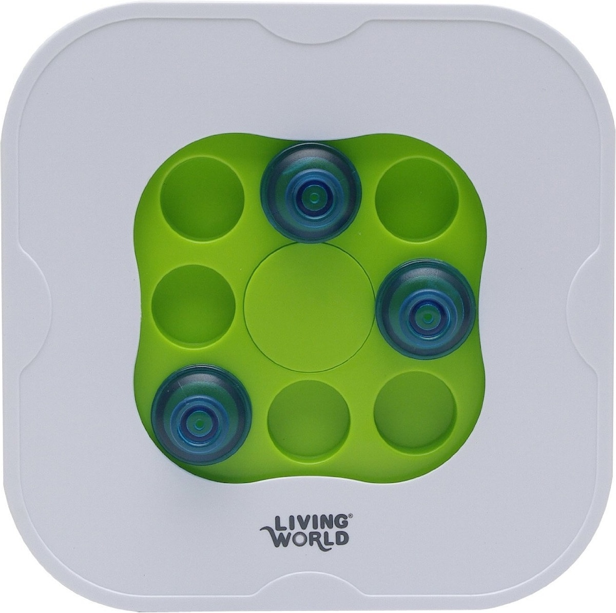 Insert the center button. Hide treats in the remaining holes. Treats must be less than 1 1/4 inch diameter. Place knobs over the holes to hide the treats. Let your small pet search for the treats by letting him use his mouth to lift the knobs and discover the treats underneath. Create more of a challenge by hiding the treats in fewer of the holes and vary their location each time your pet plays.