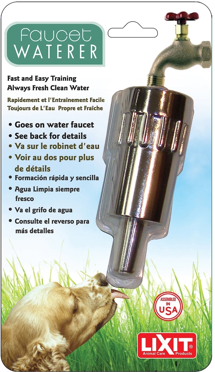 - Self-serve dog waterer installs on an outdoor faucet in seconds