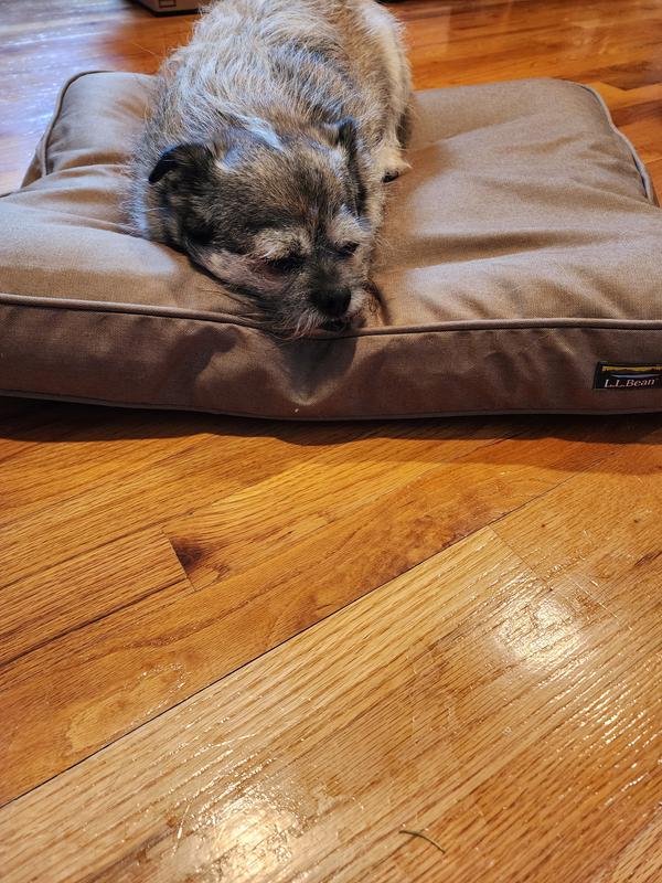 This LL Bean Denim bed is very nice. The bed itself is comfy and offers good support without being too firm. The soft zip-off denim cover seems tough without being harsh. It's also has a zipper flap and zipper garage for added protection. I haven't had to wash it yet but don't expect any issues there. My little guy weighs 16 lbs and the small fits him well. It's also a great size to throw into the car for when we're on the go.