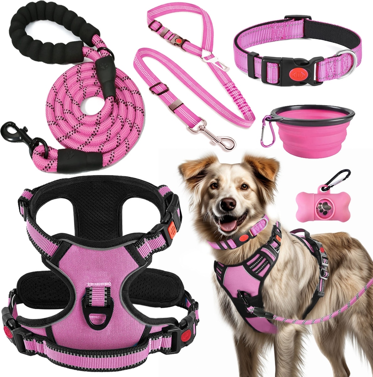 Lobeve Reflective Nylon No Pull Training Dog Harness, Collar & Leash Set with Retractable Seat Belt, Collapsible Bowls & Poop Bag Dispenser, Pink, Large: 20 to 33-in chest