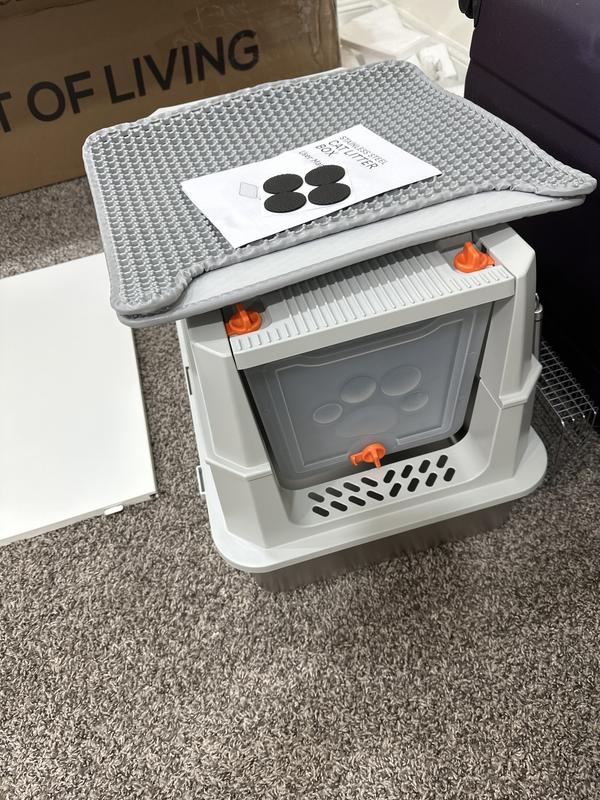 Assemble in minutes using the snap-on components. Place in a quiet, accessible corner and fill with 20 lbs of clumping litter. The high sides and enclosed design contain spills and scatter, while the mat traps stray litter. Clean weekly with mild detergent, stainless steel ensures no residual smells haunt your home.