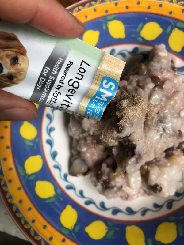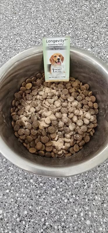 We have used Longevity15 Health Supplement for our 7-yr-old beagle for only about a week so far. It's easy to use because it comes in pre-measured packets. We add a packet to her wet food meal in the evening once a day. She does not seem to notice any different taste to her food.
