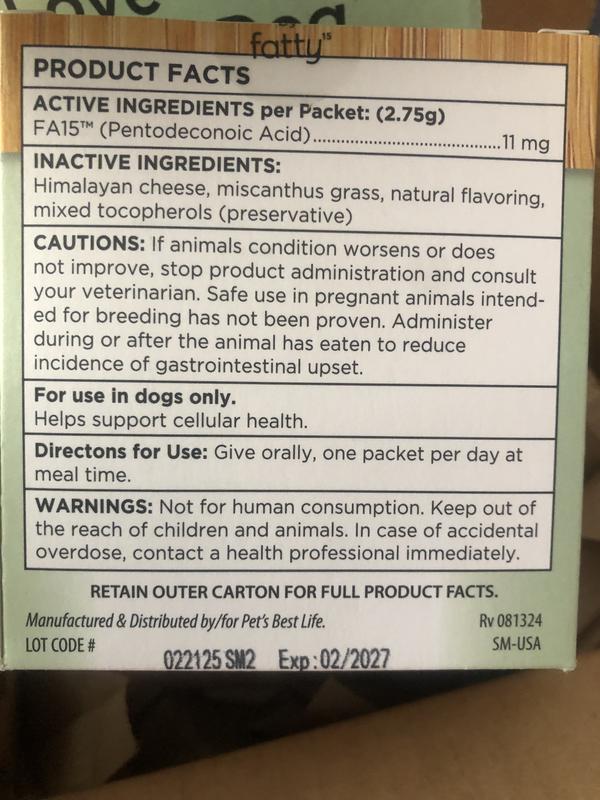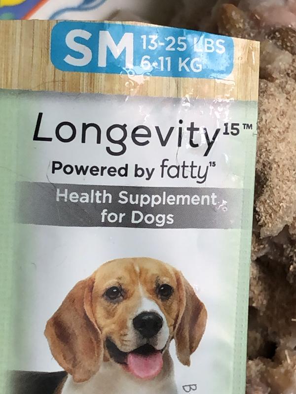 So far the Longevity supplement has been tolerated well and once mixed into my dog’s homemade food she ate some, although she did not finish her breakfast until later in the day. No negative reactions were observed. My dog is 15lb so she has the small dog option, for dogs 13-25lbs. The box came with 30 individual packets that are helpful for freshness and portion size. The active ingredient, FA15 (Pentodeconoic Acid) is said online to help increase cellular health. Now I wonder if there is a similar product for people as aging affects us all. Anyway it is too soon to tell how well it works but no issues so far!