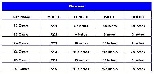 The 8 ounce bowl is 6 x 6 inches, the 16 ounce is 8.5 x 8.5 inches, the 24 ounce is 9 x 9 inches, the 32 ounce is 10 x 10 inches, the 64 ounce is 11.5 x 11.5 inches and the 96 ounce is 13 x 13 inches.