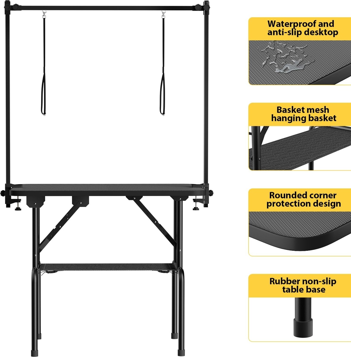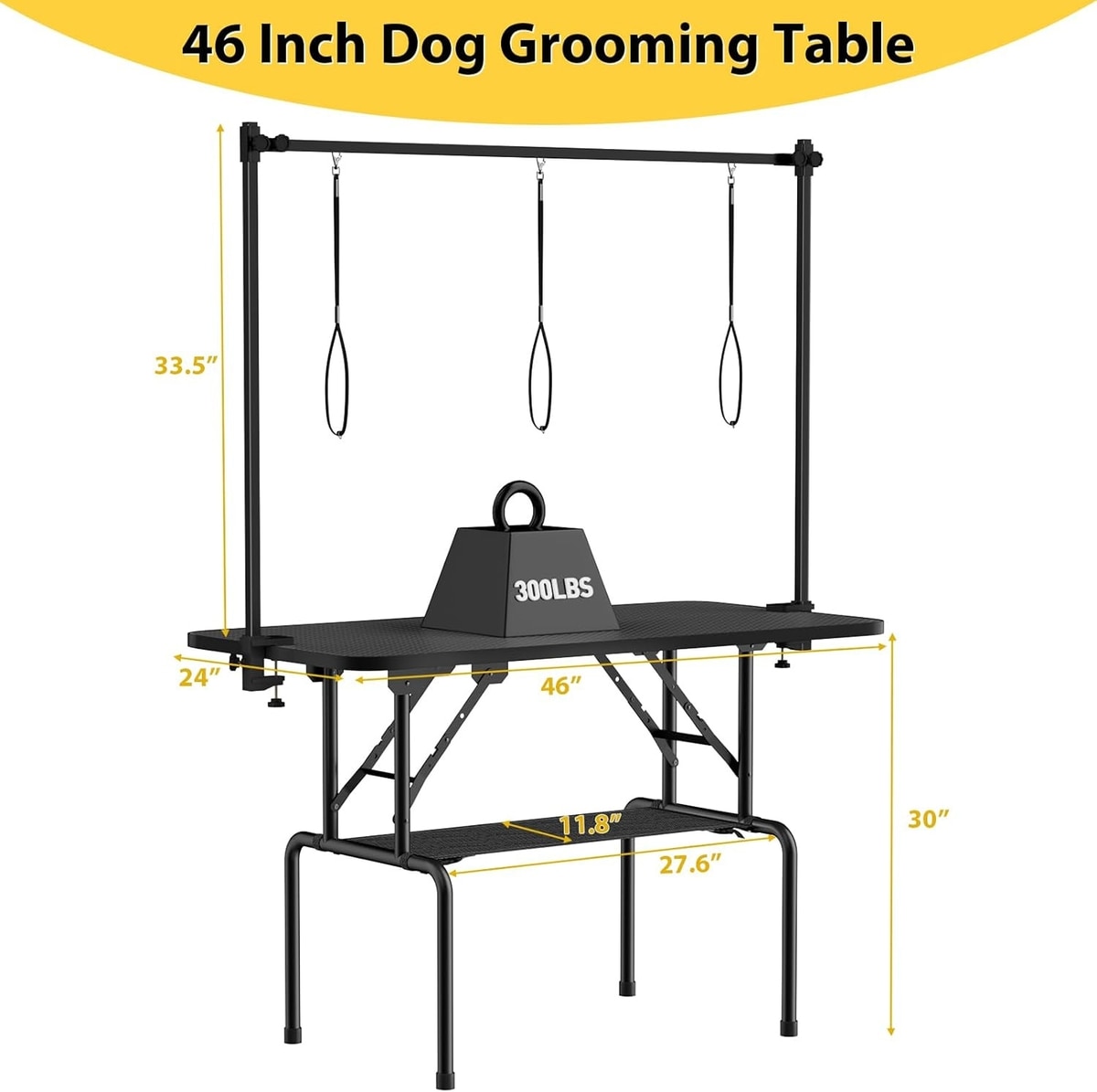 - The mesh cloth storage basket at the bottom of the table holds up to 60 pounds to store all your grooming supplies and accessories.