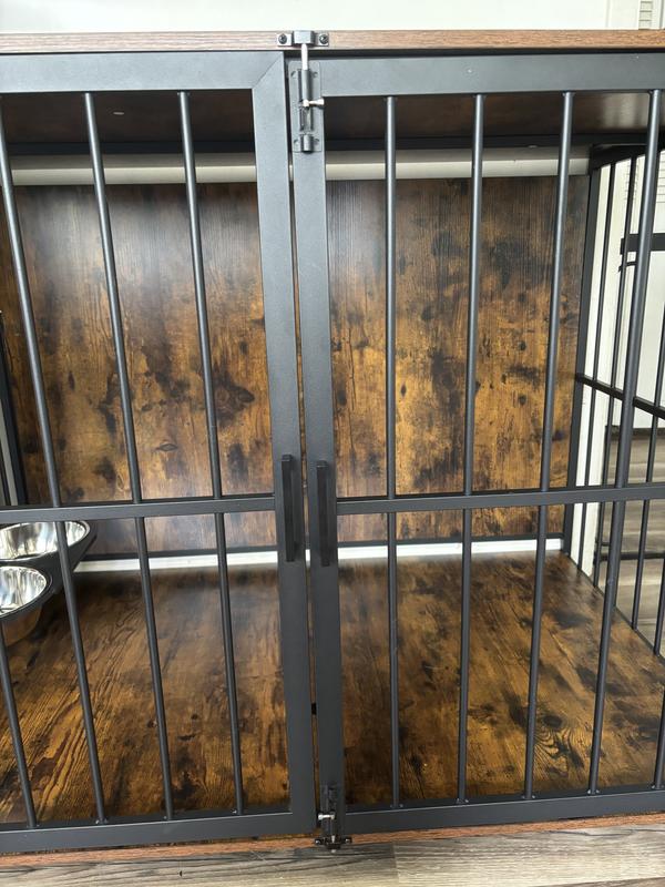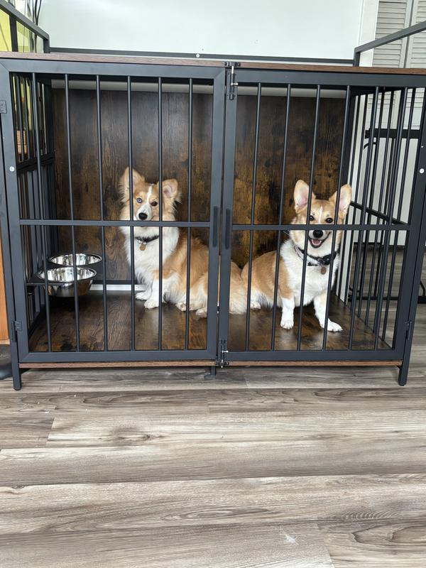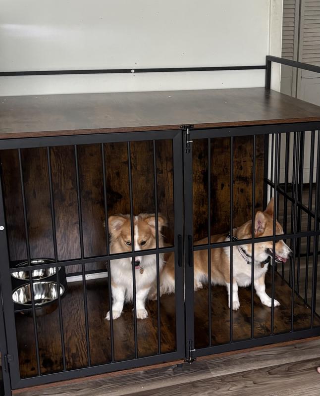 We have 5 dogs, our smallest being two 20lb Corgi pups and our largest a 100lb Golden Retriever. We chose the largest crate to be able to accommodate any of our dogs as needed. While it will mainly be utilized to keep our puppies safe when we aren’t home, it is also spacious enough for our medically fragile larger breeds should they need it. The iron bars are heavy and feel very sturdy, the wood composite also seems to be good quality (although mine was unfortunately damaged during shipping), and the hardware was durable as well. I really like the lockable, rotating door with the food and water bowl attachment. That makes it extremely easy to refill the bowls without having to reach into the crate and reduces spills from eager pups. The reason I took one star off my review is because of the doors. I am not sure if it was due to the wood being damaged and warped during shipping (as the doors fit between the top and bottom wooden platforms), or if it was just a fluke, but the doors do not line up evenly. Aesthetics aside, the right door with the latches sags, making it difficult to securely latch it in place. I was also slightly disappointed that the handles are made of plastic which felt quite flimsy compared to the high quality of the rest of the fixture. Overall I am happy with the product and believe it will serve its intended purpose well.