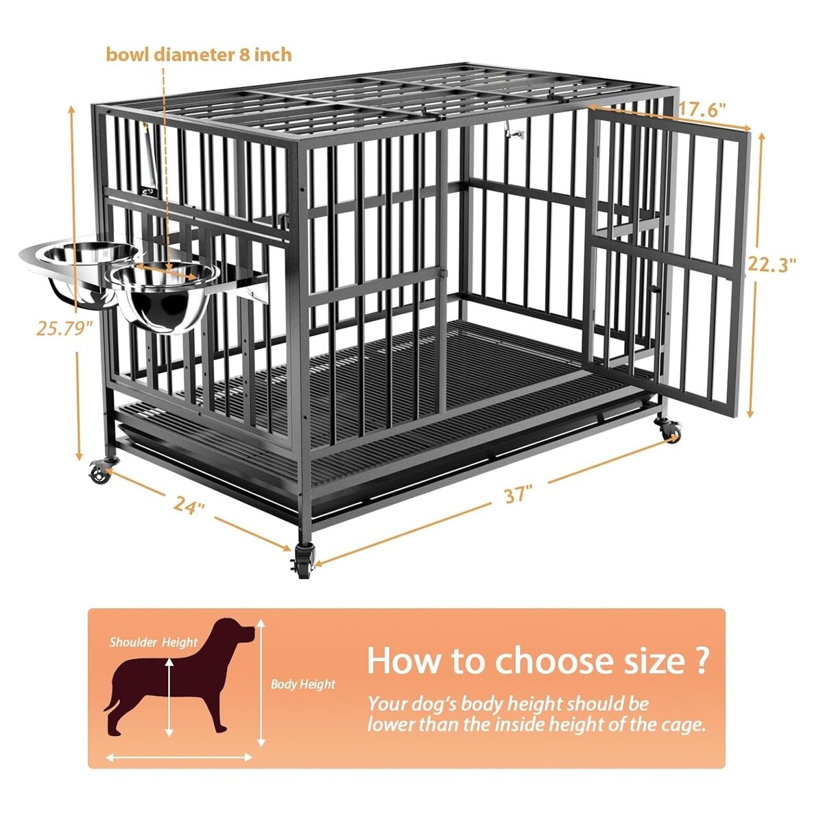 - Package includes 1 dog crate, 2 stainless-steel bowls, 2 air lift rods, 1 removable tray, and installation instructions.