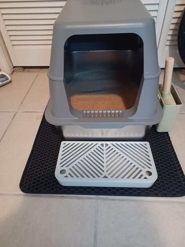 This is a nice box! Love the stainless steel bottom! My two cats have never used an enclosed box before. So I started with just the metal bottom. Then once they used it I added the high side. Then added the top. Love that it comes apart in three parts. Love that it comes with the scoop, holder and a Matt. It’s a good light weight and I even like the color.