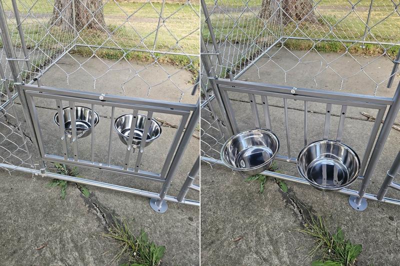 This outdoor dog kennel is a great size - spacious for the pup and doesn't take up too much room in the yard. The rotating food/water bowls is a great touch so you