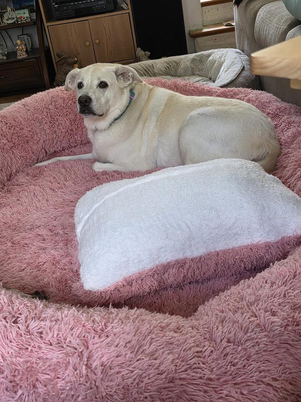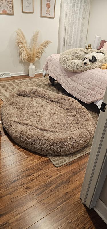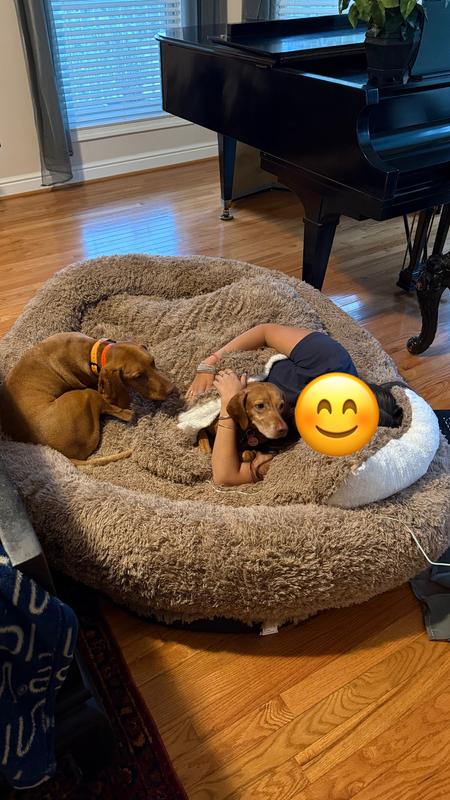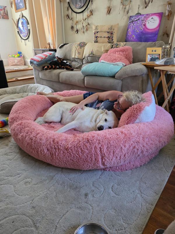 - This oversized bed is designed for pet parents and their furbabies to relax together.