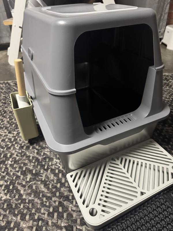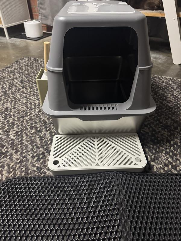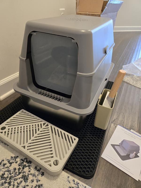 - This litter box comes with a double-layer litter mat for a comfortable stepping surface and extra tracking protection plus a hidden hanging litter scoop for quick cleanups.