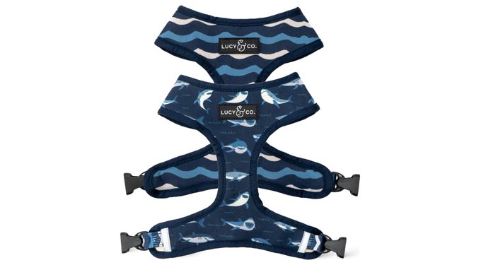 The Lucy & Co. reversible harness not only looks great, but it feels great too. Made with water-repellent neoprene, this harness features two prints in one, a D-ring for your pup’s leash on the back, and an adjustable chest strap for the perfect fit.
