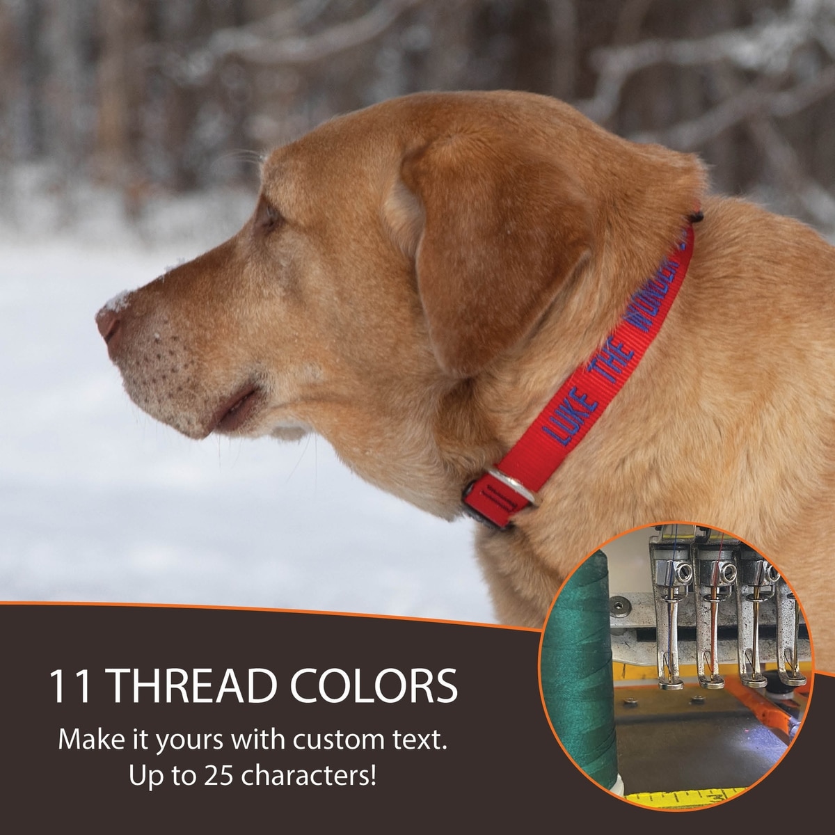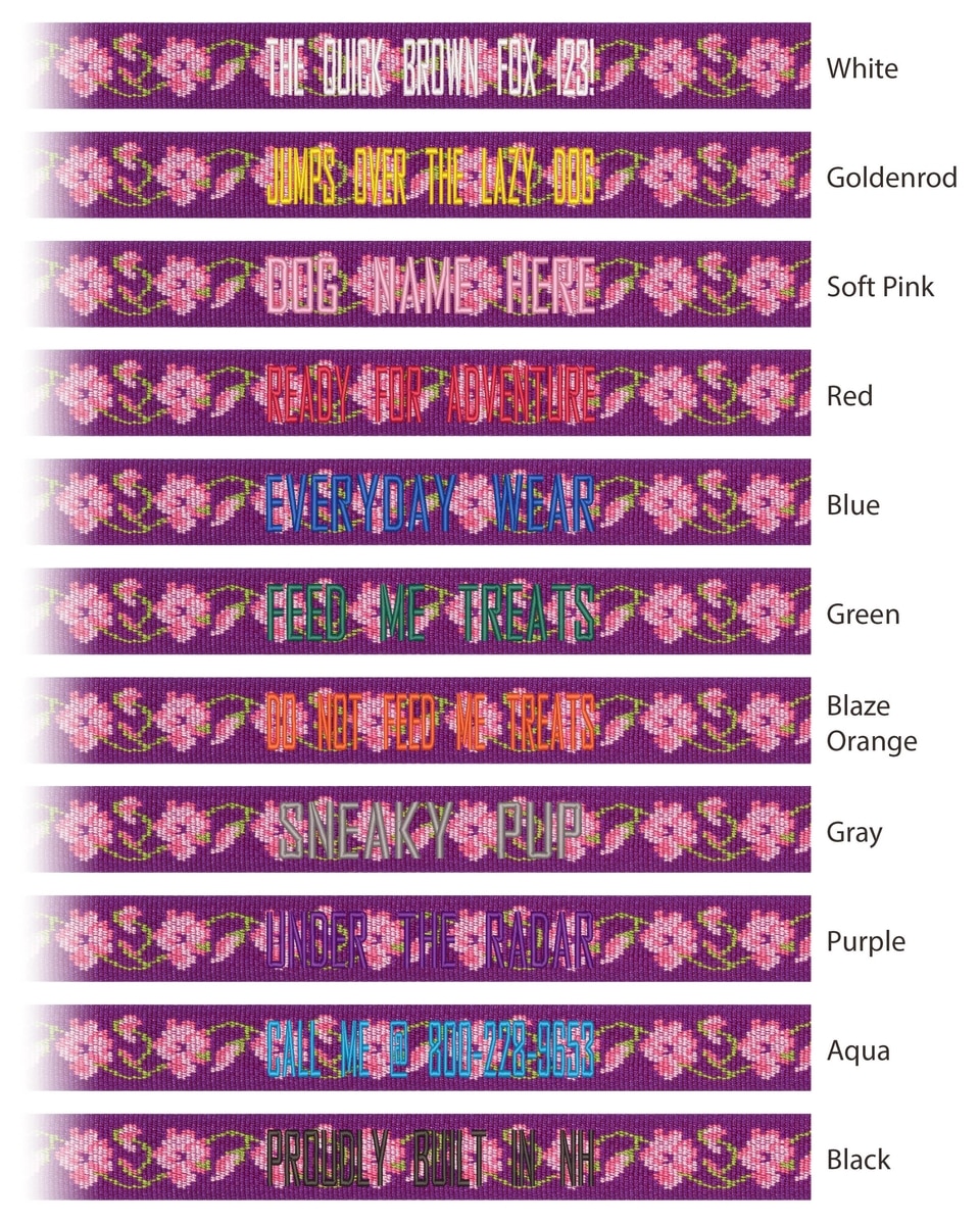 Use the non-slip tri-glide adjuster to tighten or loosen the collar, push the webbing through the slider to create excess material, then pull it through on the other side to adjust. The molded teeth in the adjusters keep it securely in place, ensuring a snug yet comfortable fit. When adjusting the collar to properly fit your pet, there is a possibility that the plastic slider could rest over some of the custom embroidery. We recommend choosing the smallest possible size range to fit your pet.