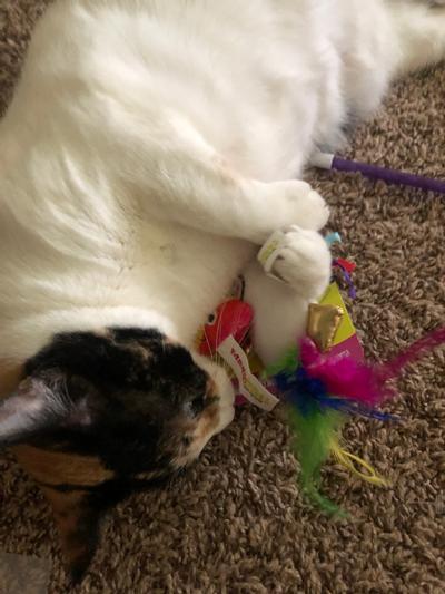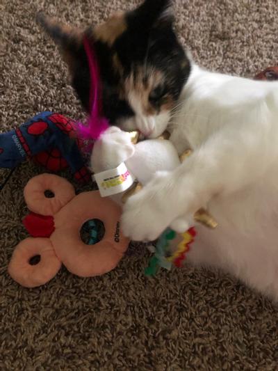 My cat got in the Chewy box and started to dig under everything until she found this toy. She went nuts on it. I had to pry it away to cut the backing and tags off. She loves this toy! I think having the feathers gave it an extra fun factor for her because she adores feathers!! So cute! My little kitty felt left out so now I am going to have to get him a Silvervine toy too as the rainbow poo was not big enough for him to play with.