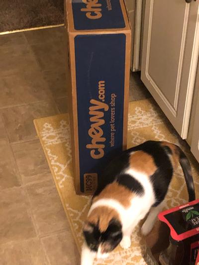 I ate always sits and waits by her Chewy boxes. I opened the box as soon as we got it, and she climbed in to pull this toy out, packaging and all. I could barely