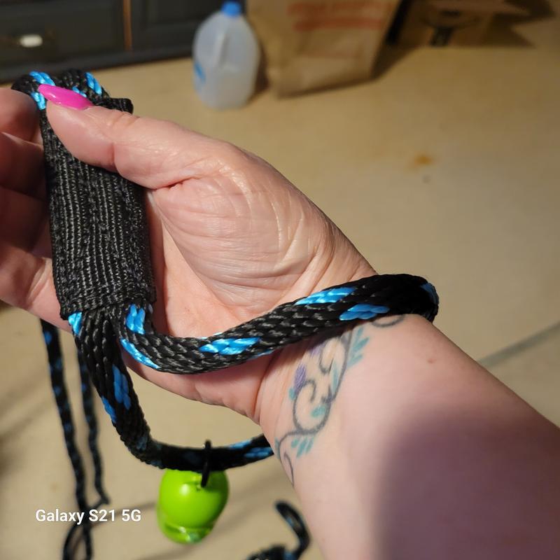 The neck loop is too big for my dog’s neck and cannot be adjusted. He could easily slip it. Additionally. The two 8’ long ropes are heavy and awkward. Was excited