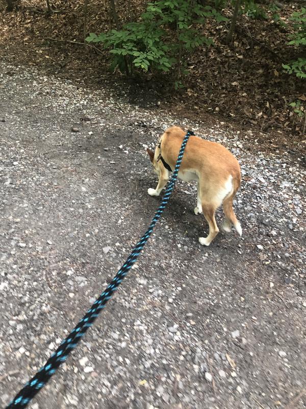 What a great leash! Durable and easy to use. Has an adjustable part to place over dogs head that can be tightened. Very nice lenth and srge size loop to put my hand through. The emblem is rubbery so it works as a nice grip. This leash also didn't pull on my dogs trachea like others have done. The walk went smoothly and Alice loved her freedom with this lenghth of leash.