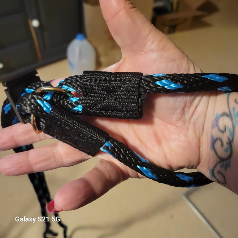I ordered this because I wanted a longer version of the Mendota brand martingale slip lead but they don’t offer it. The double strands all the way up make it cumbersome to handle. Why do we need all that, no dog has a head that big. It’s too big to use w a 30lb or smaller dog. I wish it had a smaller neck loop piece and single stranded beyond what is needed to fit a St. Bernard /mastiff. I had hoped this would be handy with a wide variety of dogs but I am going to see if I can return it. It does seem well made and comfortable material and it came with free poop bag dispenser with bags which was a nice surprise. The e 90 degree angled tabs on the neck part look potentially uncomfortable for the dog, (they’re very stiff not pliable)