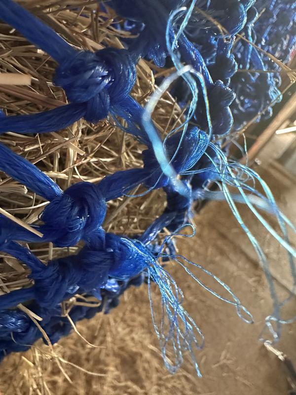 after 1 use the hay net was unraveled in three places, bits of nylon pulled apart, and black rope for hanging also unraveled. This is a potential hazard for horses
