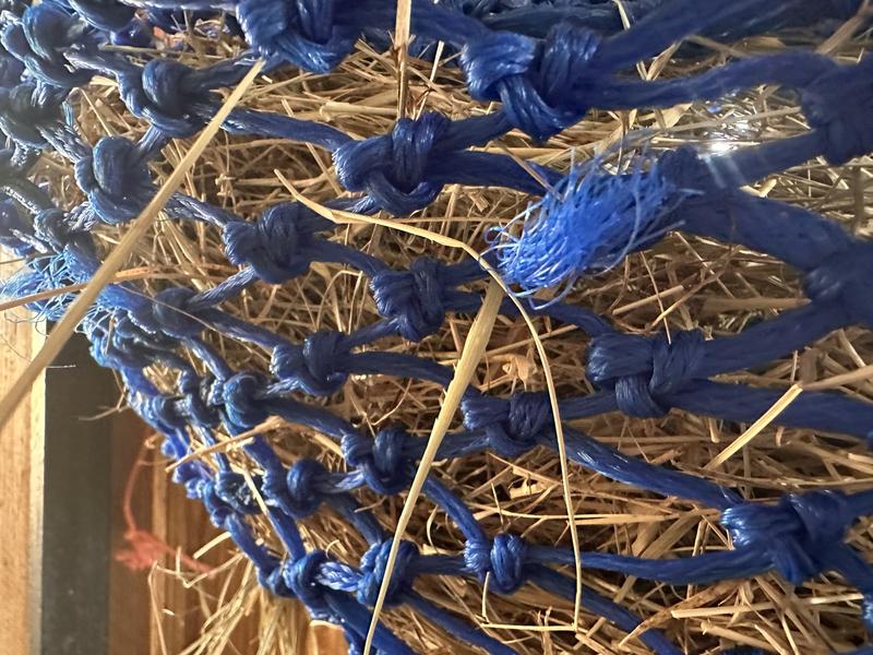 after 1 use the hay net was unraveled in three places, bits of nylon pulled apart, and black rope for hanging also unraveled. This is a potential hazard for horses if ingested. I will hopefully be able to return,/ refund. Also openening to fill net was very small making it difficult even with a hay helper to load net. cannot recommend this product.