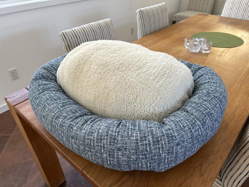The bolster is made of a durable 100% Cotton with Sherpa Center and is stuffed with premium high loft Polyester fiber fill.