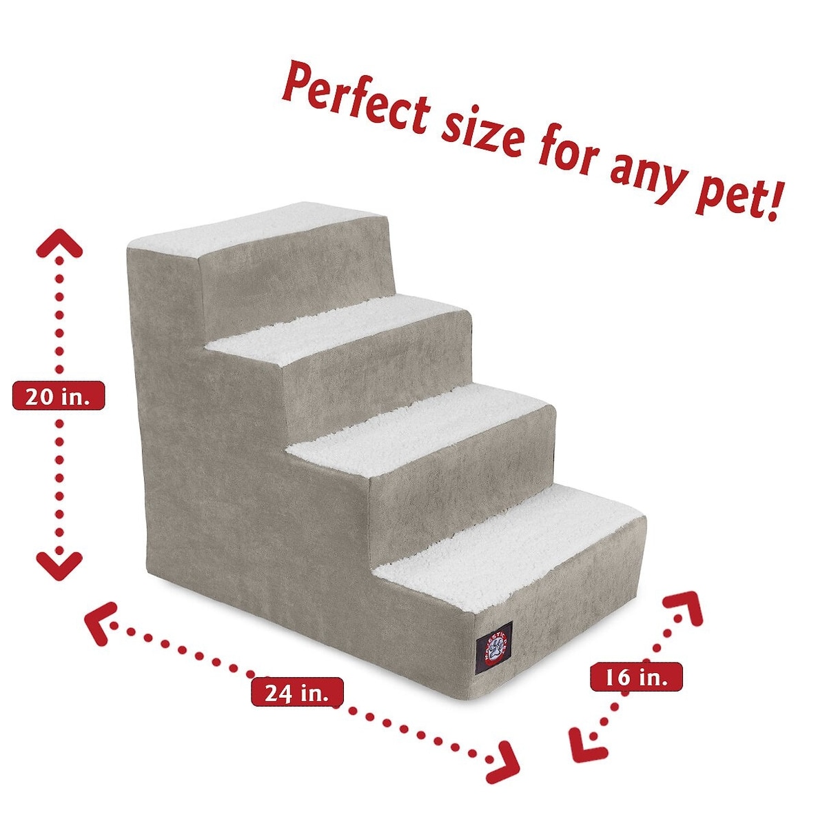 The 3-step stairs measure 18 inches long x 16 inches wide x 15 inches tall and the 4-step stairs measure 24 inches long x 16 inches wide x 20 inches tall.
