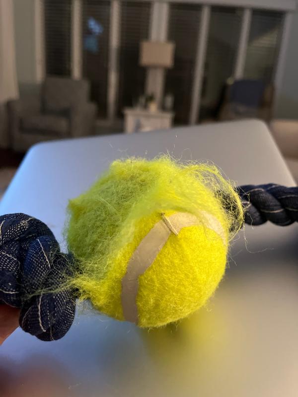 We had hoped that this would last a little longer, as it seemed like it was higher quality. However, last night we found our dog tearing the green fuzz off the outside and he had pierced the inner rubber part of the tennis ball. Disappointing!