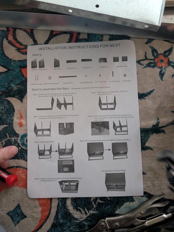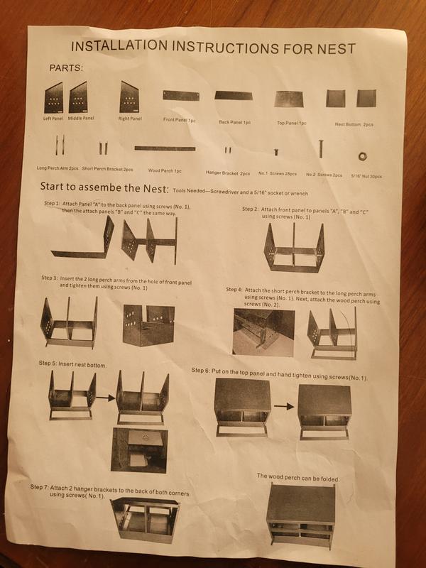 First, the color photo on the box which would have helped me immensely, was covered by the address label! The tools needed said, screwdriver and a 5/16" socket or wrench. Those were useless since the 516 socket was too big. Don't know why a screwdriver was needed. I ended up using a Phillips screwdriver and a pair of pliers to secure the nut while I screwed! I didn't like the sharp edges either and after two hours, I gave up! It was not fun Trying to put this nesting box together. I would rather have built a wooden nesting box which would have taken me maybe 40 minutes to cut and screw. By the way, there were no hanging brackets Inan closed. I do not recommend.
