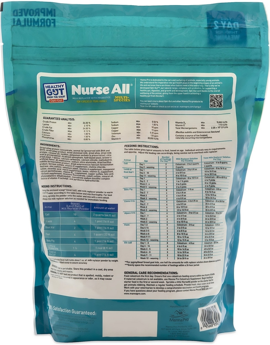 GENERAL CARE RECOMMENDATIONS: Feed colostrum the first day. Ensure that one colostrum feeding occurs within two hours of birth. If maternal colostrum is not available, use Manna Pro Colostrum Supplement. Begin feeding a starter feed in the first or second week. Sprinkle a little Nurse All powder on the starter feed to get animals nibbling. Maintain a regular feeding schedule. Provide fresh, clean water at all times Work with your veterinarian to develop a comprehensive vaccination and health program. If you have questions about your feeding program, please contact Manna Pro at (800) 690-9908 or www.mannapro.com.