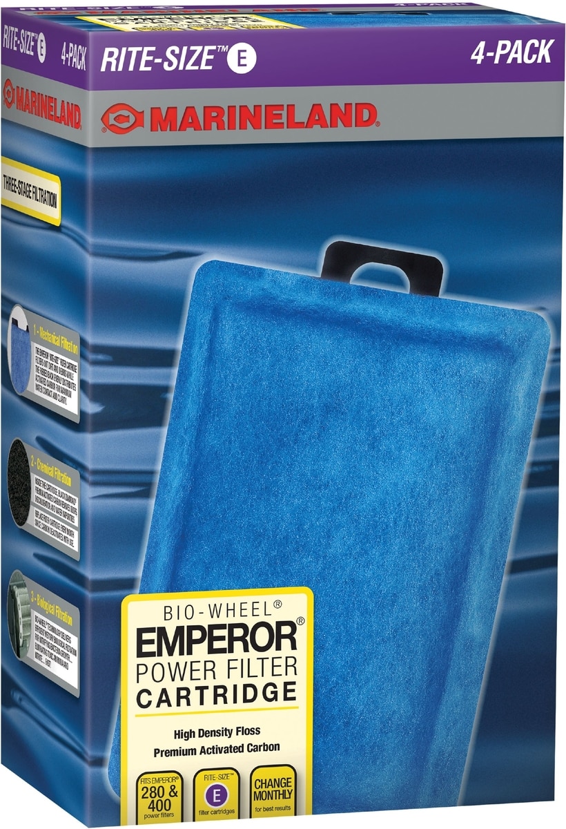 The Marineland Bio-Wheel Emperor Rite-Size E Filter Cartridge is designed for use with the Emperor 280 & 400 filters (sold separately).