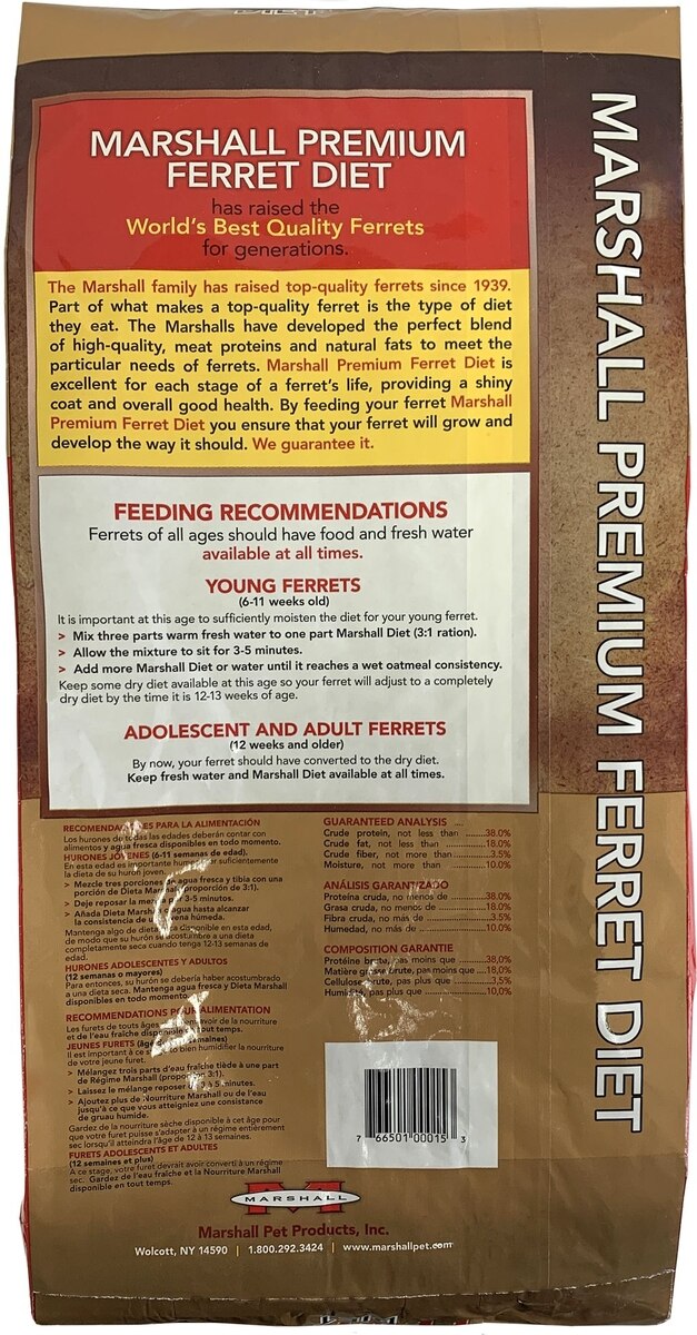 Do not buy Marshalls ANYTHING due to the fact, it has bad ingredients that shouldn’t be in ferret food, it can be bad for their health examples: corn meal can cause more prone to diseases, urinary issues and poor nutrition, also Marshall’s is a bad company overall, unethical breeding causing poor health. I prefer oxbow ferret food!