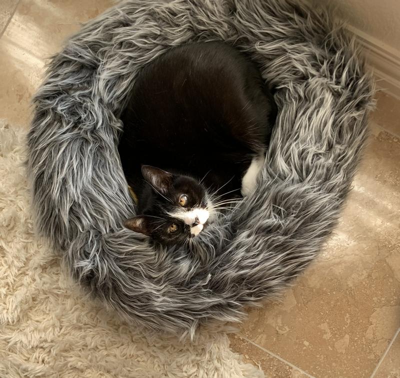 My void kitty has become one with the donut bed. She barely gets up to eat. Instead, she curls into the cozy donut center and cultivates a black hole. There is