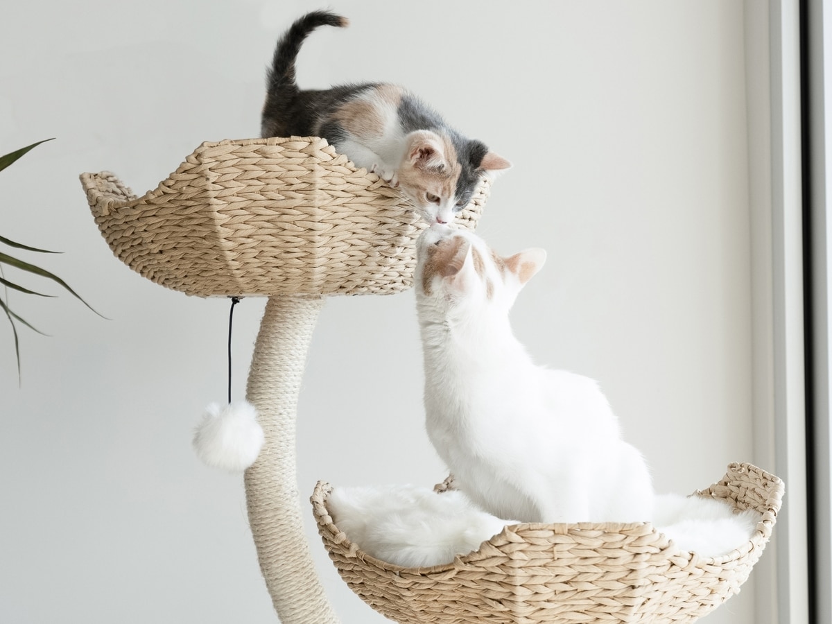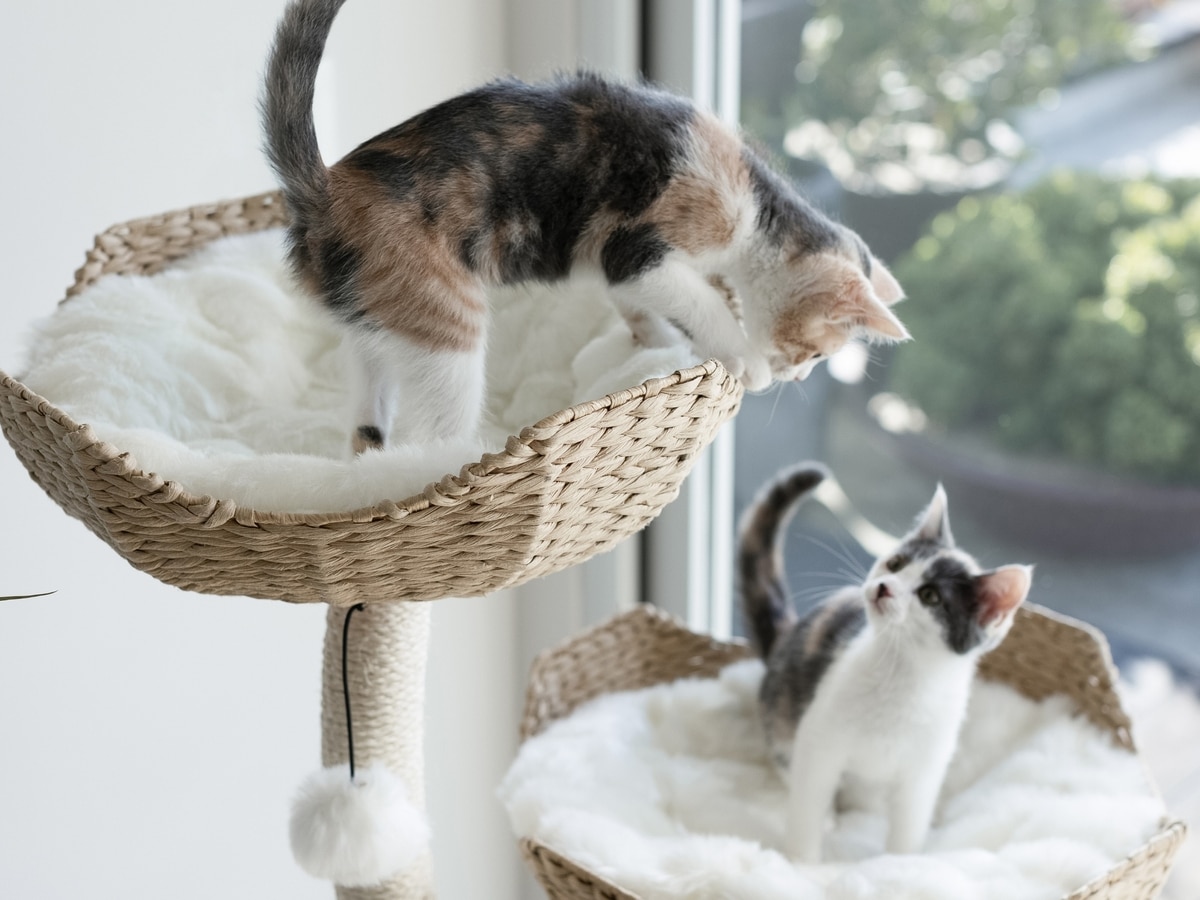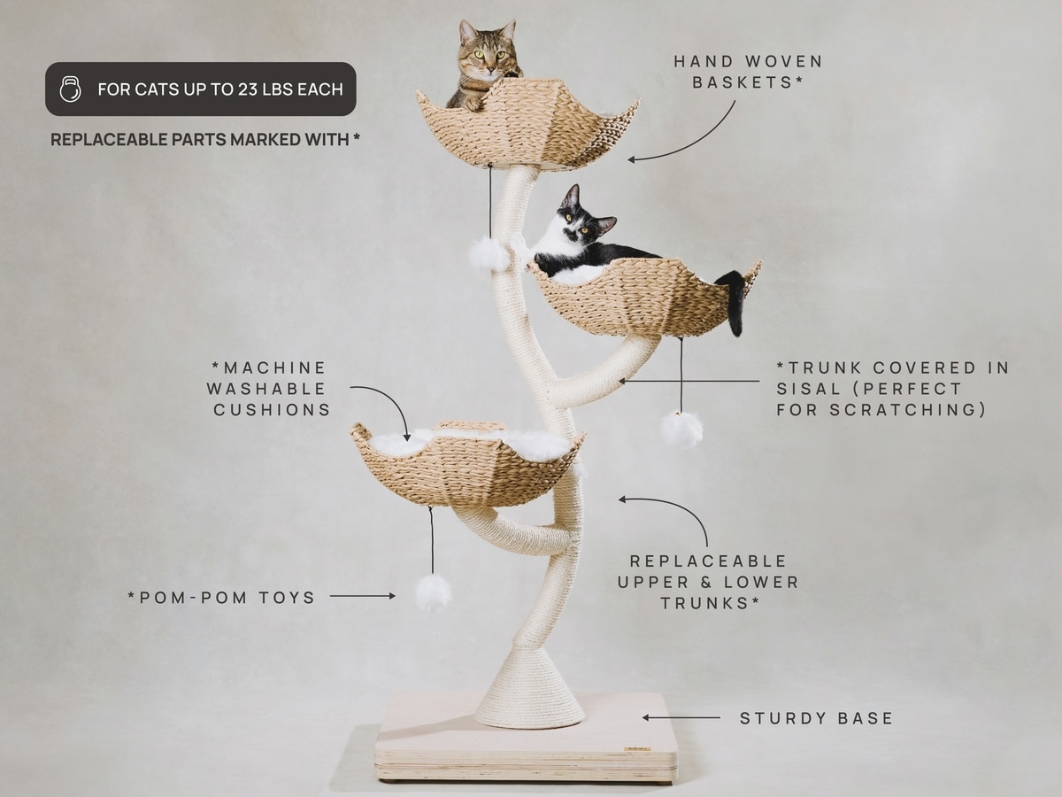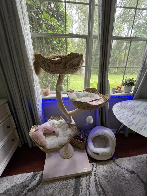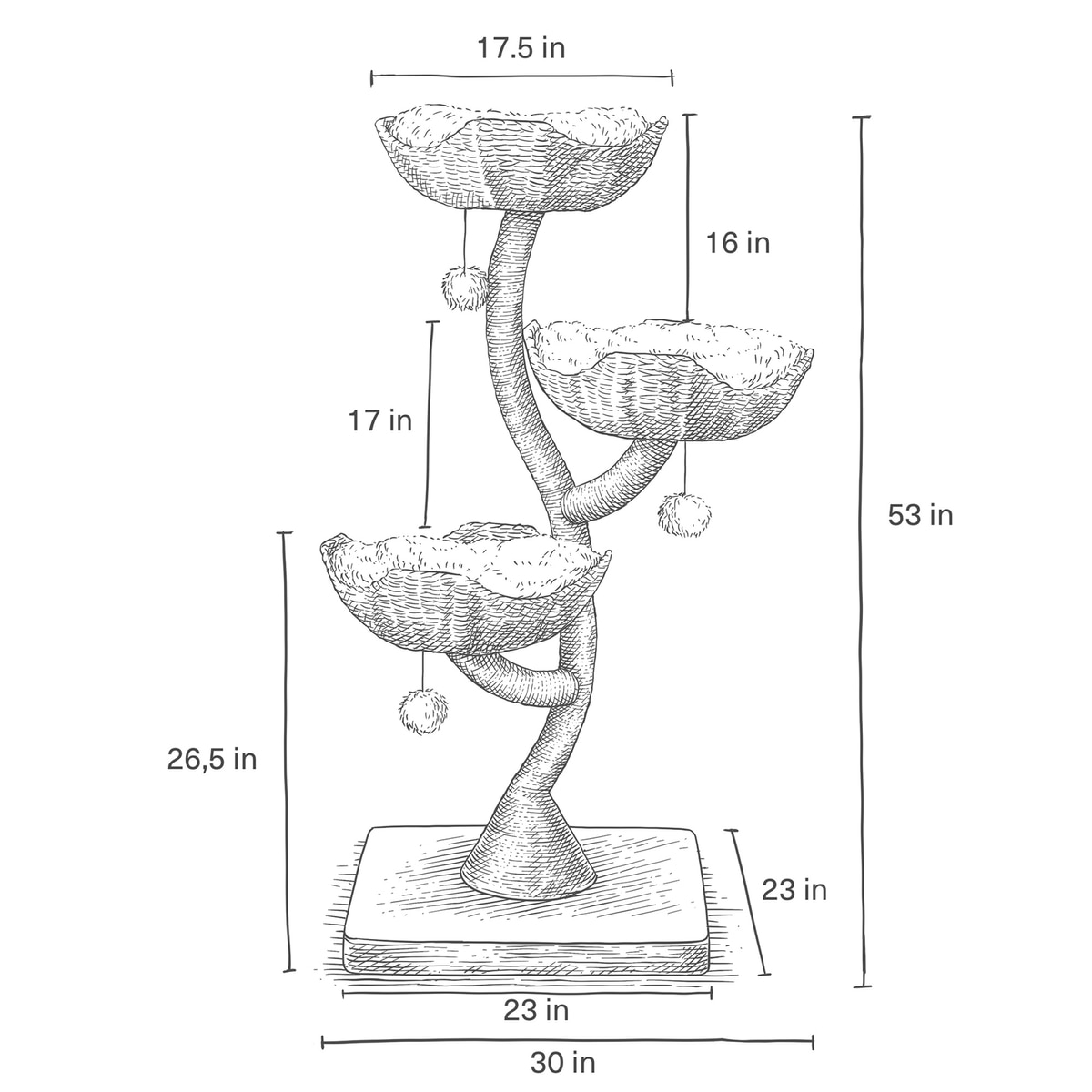 - Features three cozy baskets at varying heights ranging up to 53 inches.