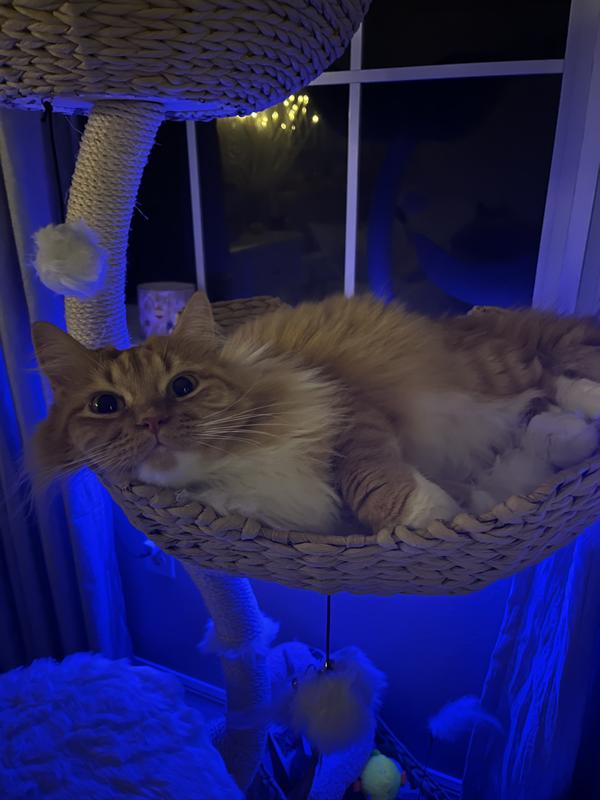 My cats LOVE this cat tree! Each perch allows for a good view of their space in whichever room you choose to use it in. I have this tree in our living room alongside our windows and the cats absolutely love lounging, Sun-bathing and napping in it. Not to mention, the little white fur balls with bells and scratch tower! My biggest cat fits himself in these beds sometimes extending its body over or curling up like a ball. I was hesitant on purchasing such an expensive cat tee but if you have the means, it’s worth it! It’s getting great use and the cats love playing on it and chasing each other on it too! They sometimes fight who gets the “high rise” bed. For reference of sizing, my gray cat is about 25lbs and very long, and fits just fine.