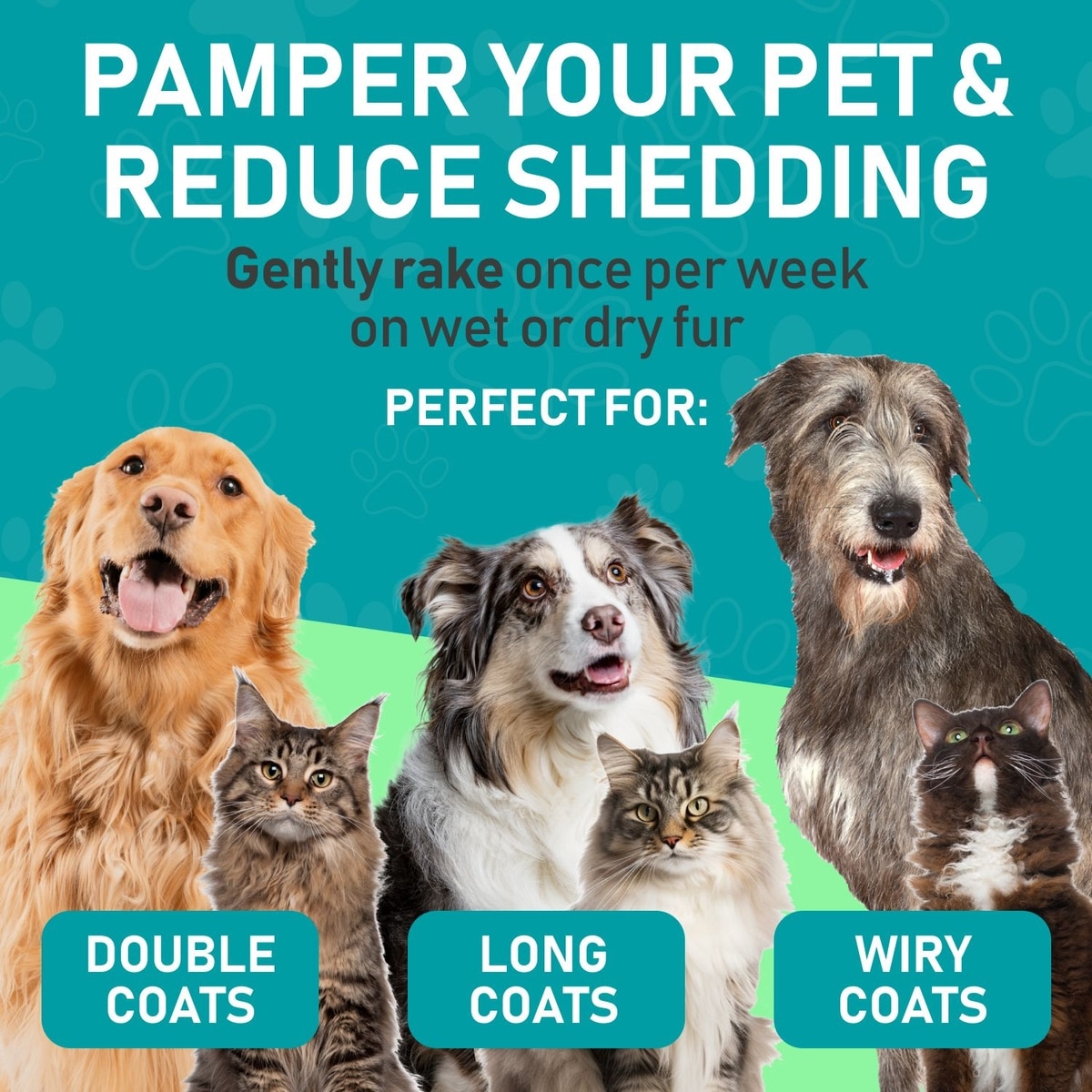 This tool is designed for double coats, long coats, and wiry coats.