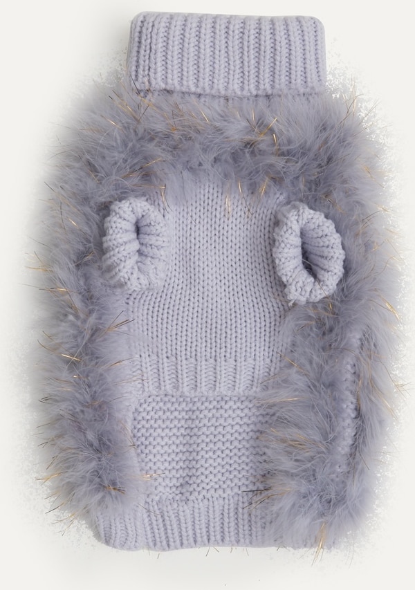- Festive dog sweater features ostrich feathers with gold lurex detail woven in for added glamour.
