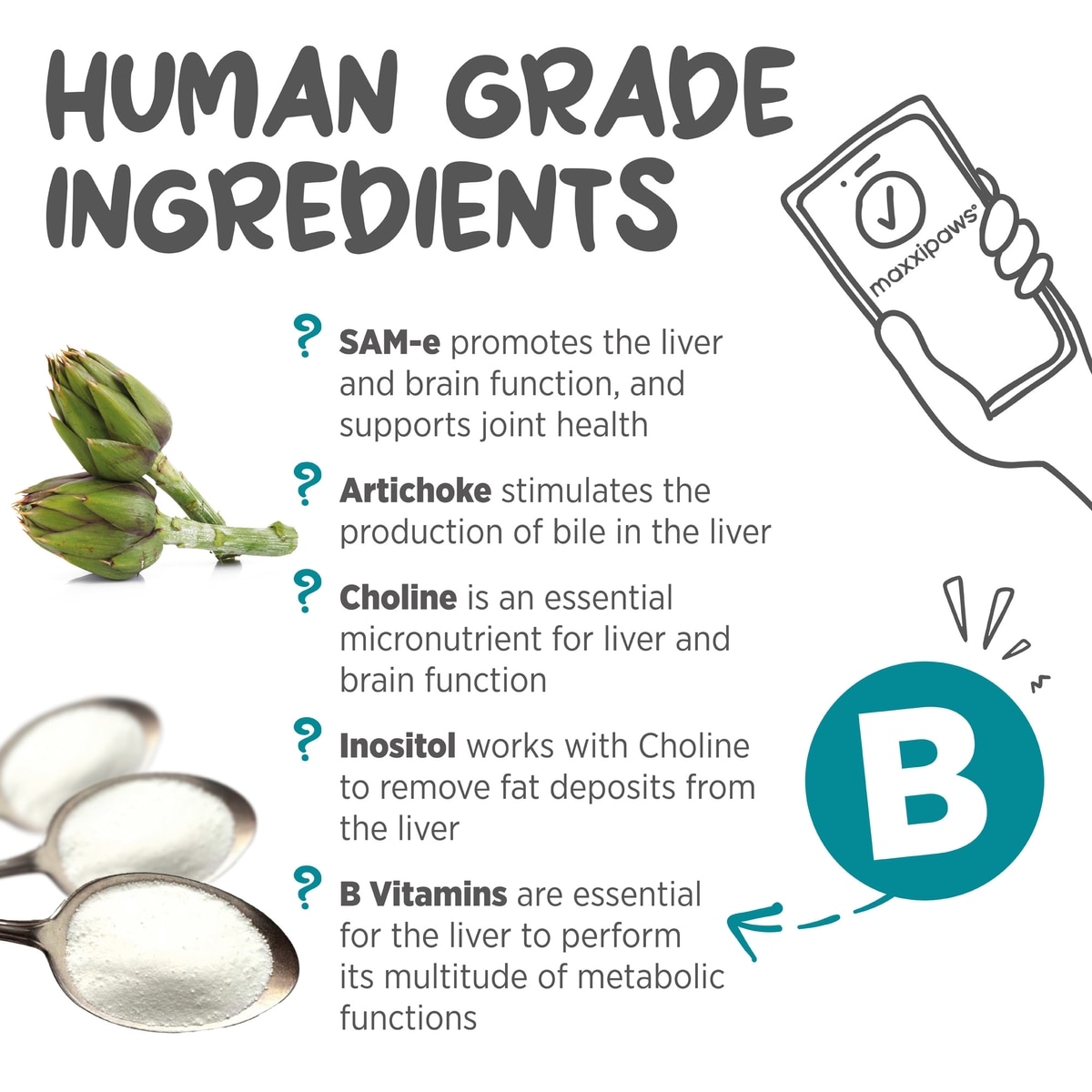 - It includes natural ingredients like artichoke, B vitamins, choline, and inositol to promote liver health.