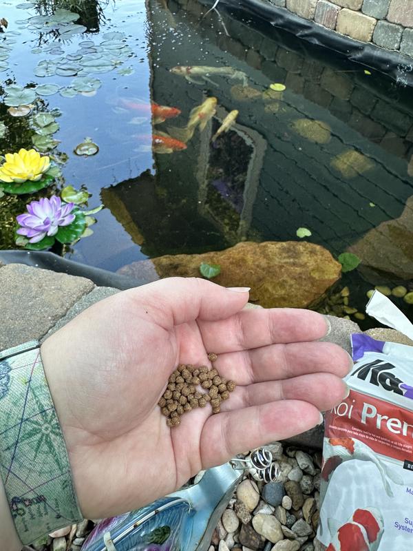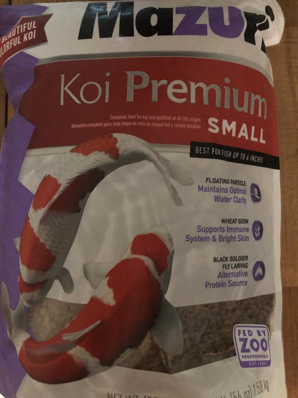 Mazuri koi premium food is an excellent food in my opinion with quality ingredients. My koi have not complained one bit! It’s for small fish, but I have three different sizes and all of them eat it up just fine. Water stays clear and fish are thriving. Excellent protein sources which includes shrimp and larvae. Probiotics and wheat germ are great for digestion. The added vitamin C is a plus. You cannot go wrong with this food. I will be feeding my koi this product from now on!