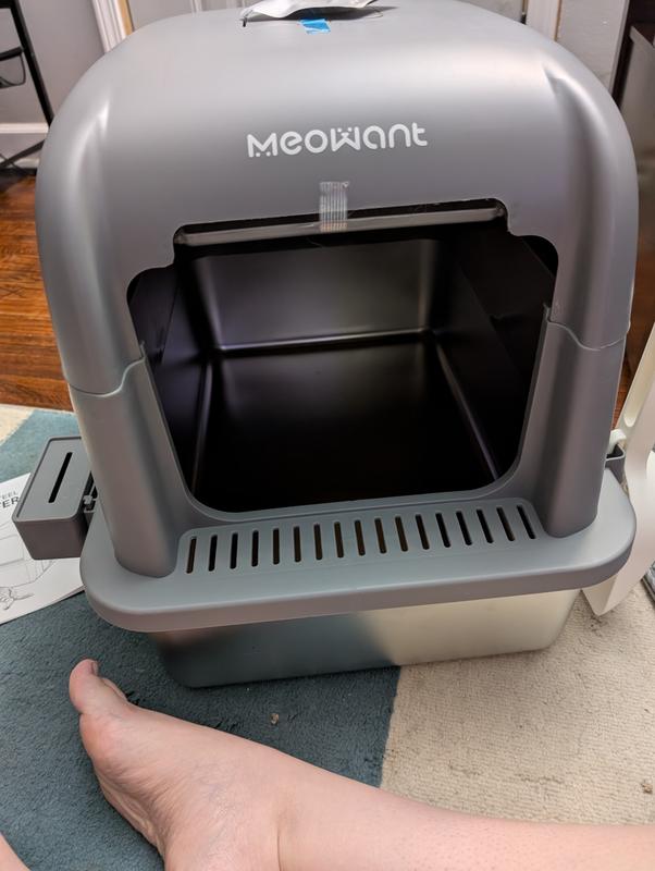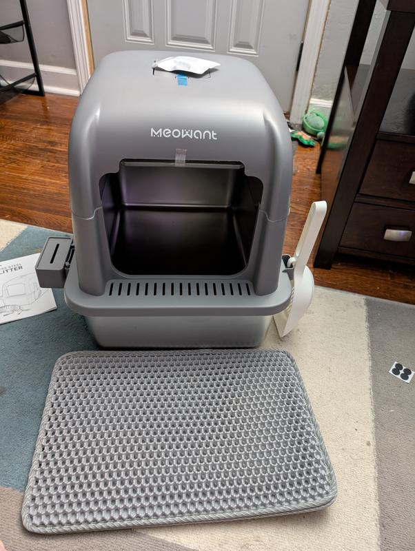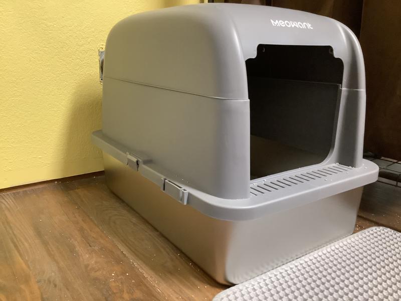 We got a second litterbox for our 3 cats now that we moved to a larger apartment. This seemed like a wonderful litterbox to put in the bathroom. The grey color matches our millennial great decor. Its a sturdy litterbox with a stainless steel bottom that has sturdy little pads on the bottom so it doesnt slide around. The bottom of the box is smooth all the way across so no litter gets trapped in grooves or anything like that. The top comes in 2 parts- one that had the sides covered and clips to the steel pan and then a lid with a swinging door that connects to the sides with magnets. For a litterbox, its sleek as heck! Problem is - my cats are so picky!! They would NOT use the box with the door on it. I tried taping it and they finally used it. When the tape failed, I knew because they left me a "gift" right outside the box. So i easily took the door off. The only one to use it is our 5 lbs older cat. The older cat is now the only one to use it. I dont know why on earth the bigger 2 cats dont use it besides they feel claustrophobic. I know they fit! They have gone inside!! The old lady uses it though and cat easily climb in and out. The matt that came with it is super helpful to catch the litter that inevitability tracks on their paws. Its super easy to clean, i just wipe it down with a disinfectant cloth when it needs it. Cleaning the litter is super easy because i just easily remove the lid with one hand and replace it when im done and it locks into place woth the magnets.theres plenty of room to see in the litterbox and clean it even with the sides on. Overall I really love this litter box. I just wish all my cats loved it too.