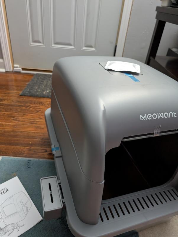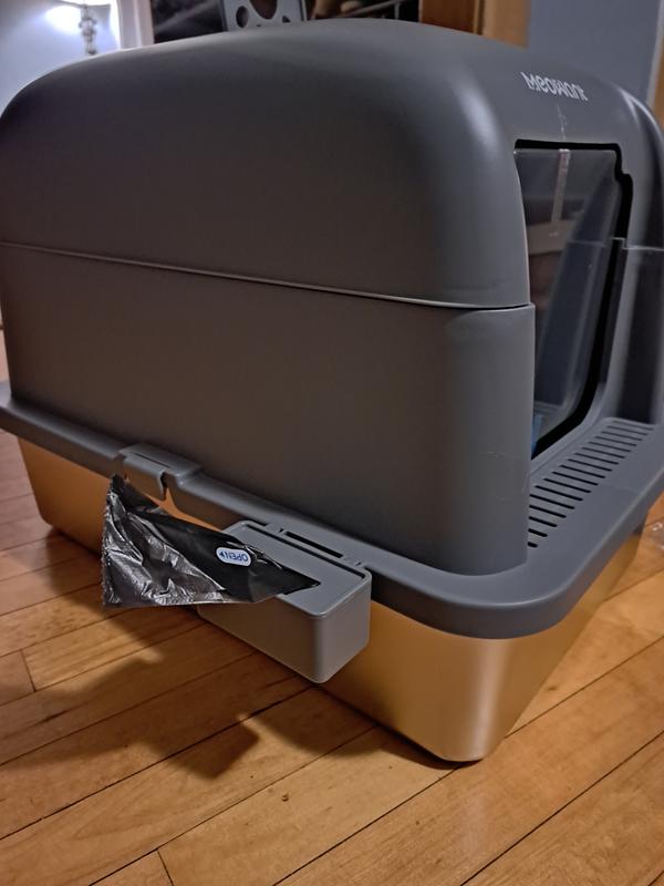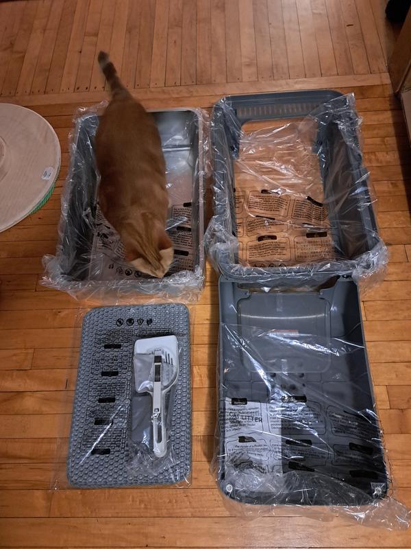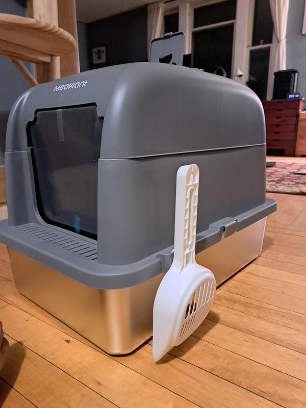 We got a second litterbox for our 3 cats now that we moved to a larger apartment. This seemed like a wonderful litterbox to put in the bathroom. The grey color matches