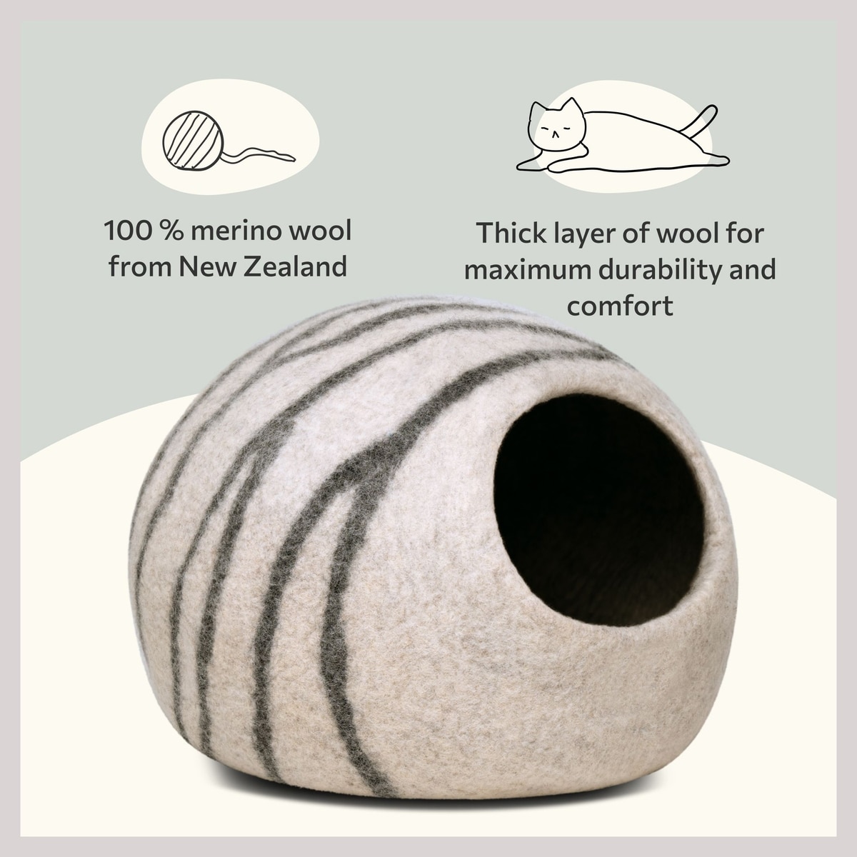 Meowfia cat caves are crafted from merino wool, chosen for its exceptional softness, durability, and natural breathability. Feel the quality in every stitch. It’s comfort your cat will love for seasons to come.