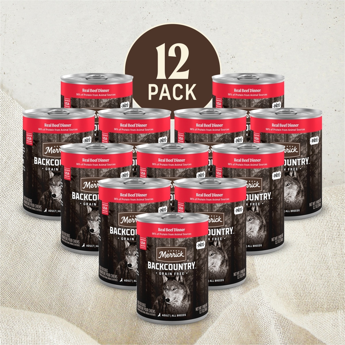 - Merrick Adult Grain-Free Beef, Lamb & Bison Pate Canned Dog Food, 12.7-oz can, case of 12$45.36 Chewy Price$50.28 List Price$43.09 Autoship PricePromo, New Customers Only: Spend $49+, Get $20 eGift Card +1 deal