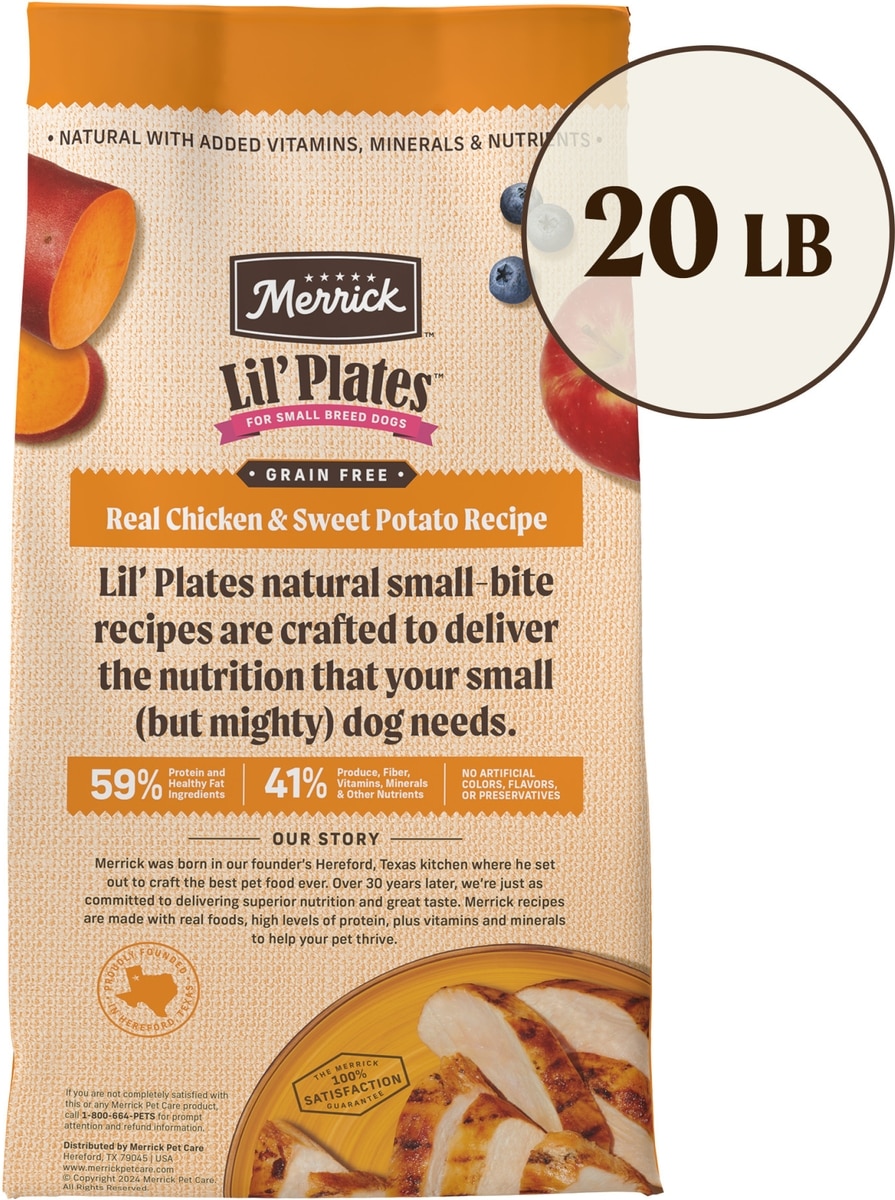 - Merrick Lil' Plates Grain-Free Chicken-Free Real Beef + Sweet Potato Recipe Small Breed Dry Dog Food, 20-lb bag$70.98 Chewy Price$67.43 Autoship PricePromo, New Customers Only: Spend $49+, Get $20 eGift Card +1 deal