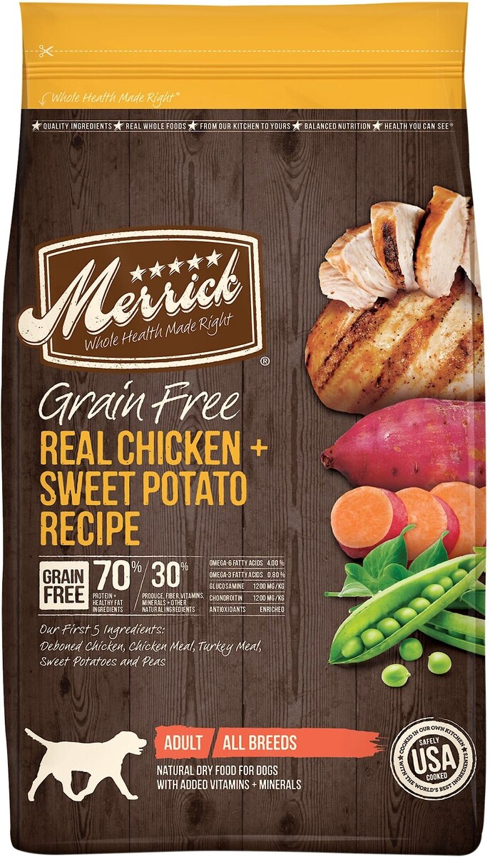 Merrick Grain Free dog food comes in many delicious recipes that your dog will love. These natural recipes with added vitamins, minerals, and nutrients come in a variety of protein choices, flavor options, and food textures so you can find the perfect grain free option for your dog. These healthy recipes all contain wholesome, high-quality ingredients and are made without artificial flavors or preservatives. Merrick dog food is proudly founded in Hereford, Texas, crafted in USA facilities.